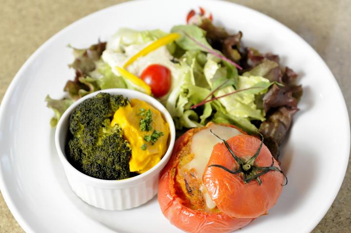 やわらかい光が射し込む広々とした店内では、国産のオーガニック野菜をふんだんに使った、ヨーロッパテイストの料理を味わうことができます。肉や魚、卵などのほか、香りの強いネギやニンニクといった五葷(ごくん)を使わないので、スパイスを少し多めに加えて、満足感の得られるしっかりした味付けにしているそうです。白砂糖や化学調味料、添加物などを一切使っていないので、体にも安心です。