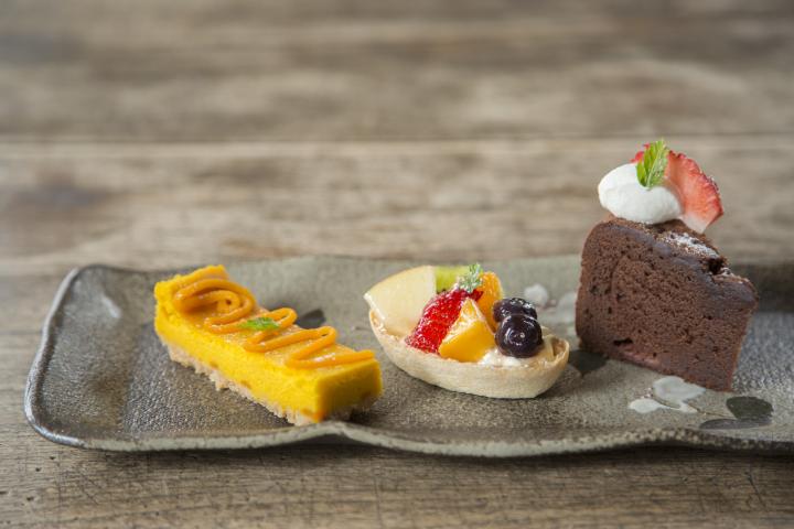 かぼちゃのチーズケーキなどがある自家製デザートセット。3品は648円(ランチセットは割引あり)