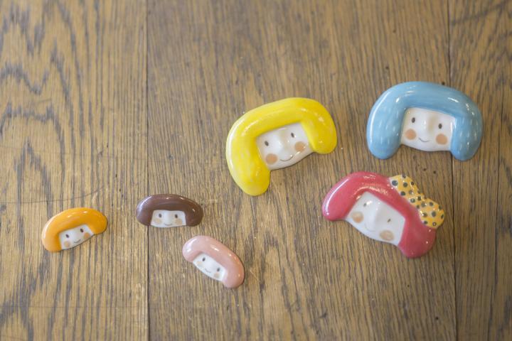 増永典子さん作の女の子のブローチ。大1080円、小648円