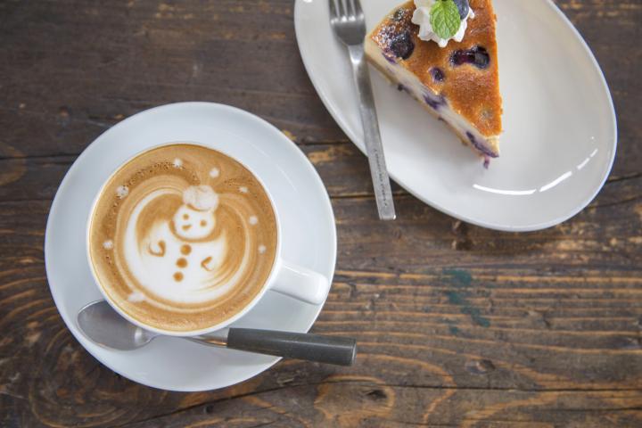 雪だるまのラテアートがかわいい「カフェラテ」(470円)と濃厚な「ホワイトチョコとブルーベリーのチーズケーキ」(460円)