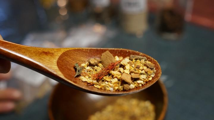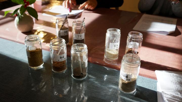 和菓子づくり、陶芸体験、日本画、しつらい講座などの数ある講座の中から、私が選んだのは和の香り創作。今回は、お正月にふさわしい「香り繭玉飾りと屠蘇散づくり」です。 ふだんの暮らしでは、精油かお香、もしくは香水を香りのアイテムとして利用していますが、それらの原料をたどっていくと薬用植物に行きつきます。講座の先生である、かほり紫代表の西島紫さんは、イギリスでアロマテラピーやハーブなどを学び、帰国してからは生薬としての植物の役割も追究するようになったといいます。肩書きは香司(こうし)。香司では一般の人にはわかりにくいので「和の調香師」と西島さんはいっています。香りだけでなく、植物の漢方からみた効能なども配慮して香りをブレンドする、香りに関する一切の責任を負う仕事です。「和の香りのスペシャリスト」ですが、西島さんは、和の天然香原料と漢方生薬が同 じということを知ってから、和の香りと漢方、嗅覚と味覚の両面の研究を重ねています。 机の上には「白檀(ビャクダン)」や「龍脳(リュウノウ)」などの和風な香りの香木や香料もあれば、ふだん料理のアクセントに使っている「丁子(クローブ)」や「桂皮(シナモン)」などのエスニックなスパイスまで、たくさんの天然香料が並びました。先生の作った調香表を参考に、好みのさじ加減で調香することもOK。ちなみに、この講座では香りを「聞く」と表現します。香道で「聞香(もんこう)」と表現するのと同じで、ゆったりと香りに思いをめぐらせ、心から味わいます。