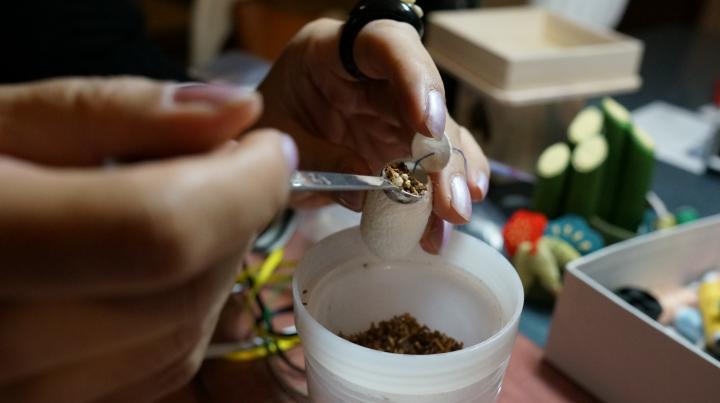 香木ひとつひとつの香りを聞きながら9種類をブレンドしました。それを5つの繭玉にわけて入れていきます。日本各地で養蚕が盛んだった時代に、繭玉飾りは養蚕農家が養蚕の繁栄や豊作を願って作られていた縁起物でした。現在では地域によっては、餅団子やプラスチックのピンポン球のようなものをネコヤナギ、ナラ、ミズキなどの木につけていますが、あの紅白の丸い球は繭玉の名残です。大正月の明けた1月8日から飾るところもあれば、14日の日没からのところもあり、地域の風習によってさまざまな模様。幸福をがっちりとかきこむ縁起のいい熊手に飾り付けてみました。本物の繭玉にブレンドした天然香原料を入れて陰陽五行説に由来した5色の紐とともに熊手に飾り付けるのは西島さんのオリジナルです。 「細かい作業が多くてごめんなさいね〜。私、こういう細やかでていねいな作業が好きなのよ」。さまざまな香りの特性を知り、どういった形で古きよき香りの伝統を伝えられるか、工夫を凝らした結果、1年中ずっと飾っておくこともできるオリジナルの香り繭玉飾りを作る事にしました。みんなが手を動かしている間も、西島さんは香りにまつわる歴史の話、宗教にちなんだ話など、準備したテキストを追いながら熱っぽく語ります。