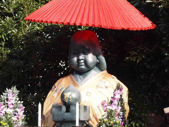 おかめ像が着物をまとうのは節分の時だけ。おかめさんが主役の節分会です
