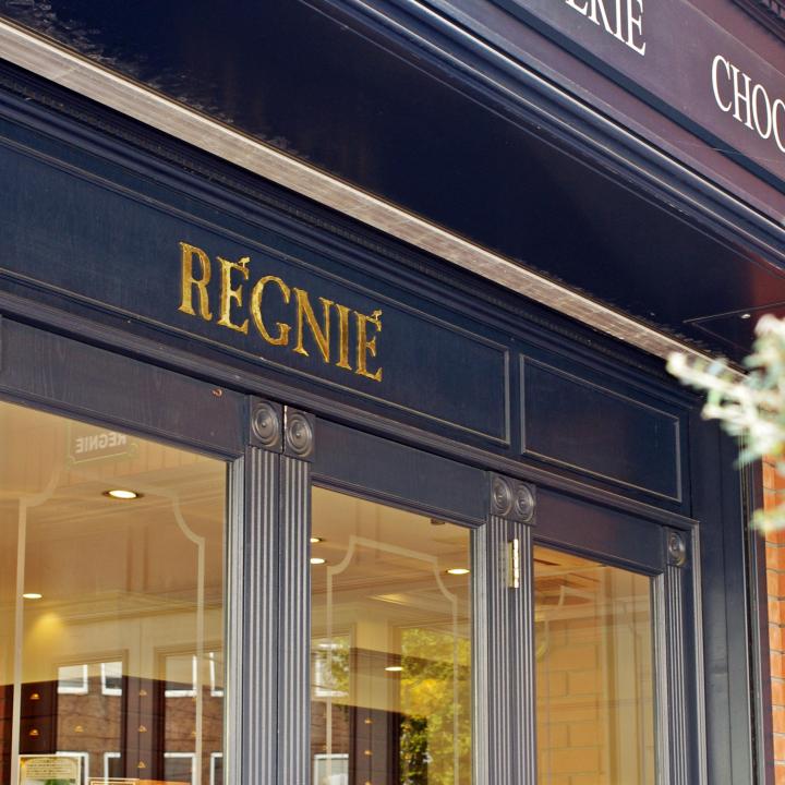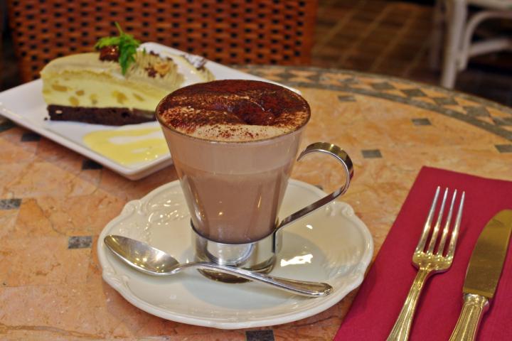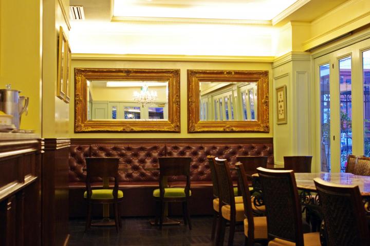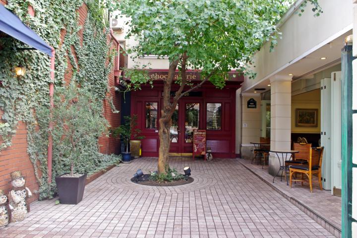 店の奥にある扉を開けると現れる、緑のゆれる中庭の先には「カフェ ブールジョン」が併設されています。「レニエ」のケーキがイートインできるほか、ガレットやサンドイッチなどの軽食もいただけます。 パリのカフェをイメージしたというカフェには、大理石のテーブルやアンティークのインテリアなどが配され、ラグジュアリーな空間が広がっています。中庭の緑を眺めながら、優雅なひとときが過ごせます。 冬のティータイムには、4種類のチョコレートをブレンドして作った、香り高いココア「ショコラ・ショー」(600円)がおすすめ。甘さ控えめでスイーツとの相性も抜群ですよ。
