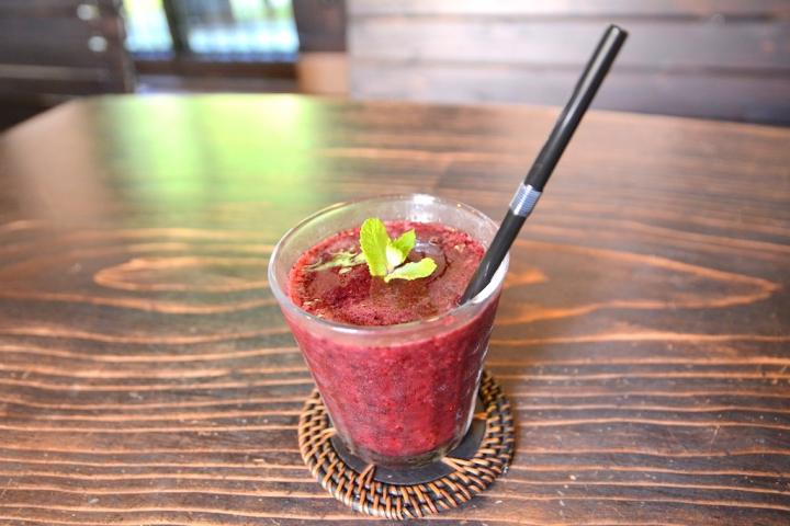 「cafe風楽里」を訪れたら、ぜひ味わいたいのが、ブルーベリーをたっぷり使った「ブルーベリージュース」(小486円・大594円)。果実の甘酸っぱさと手作りシロップで、スッキリとした飲み口です。
