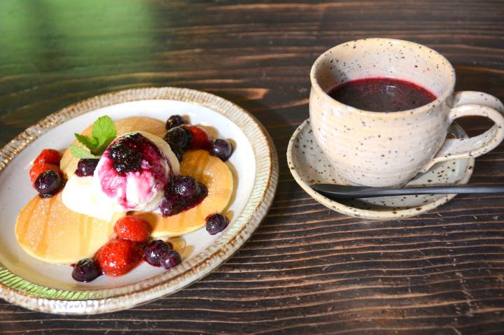 「ブルーベリーのパンケーキ」(アイスのせ 864円)は、甘めに焼かれたパンケーキにブルーベリー、ホイップクリームが添えられ、女性でもぺろりと食べられますよ。 「ブルーベリーの果実茶」(486円)は、甘酸っぱさが口の中に広がり、体の芯から爽やかになれるようなホットドリンクです。ドリンクは全てテイクアウトができるんですよ。大自然の中のドライブのお供にもぴったりですね。