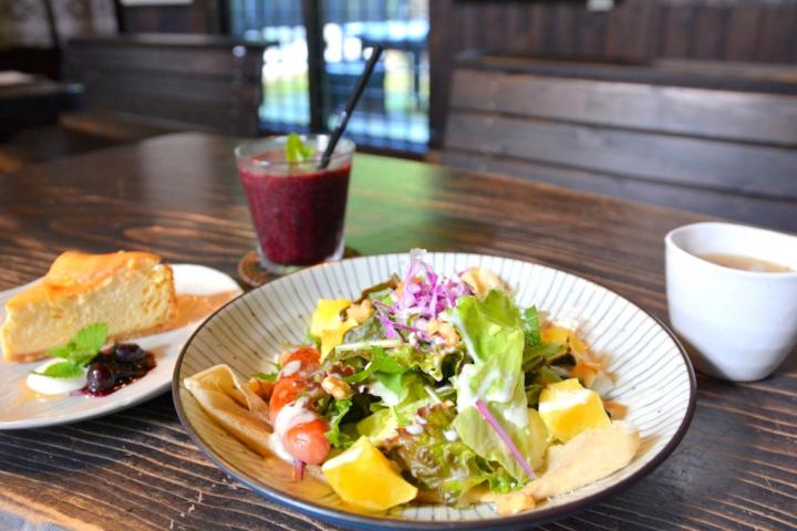 「cafe風楽里」では、近くで採れた野菜を使ったランチも楽しむことができます。 ランチは数種類の中から選べます。「ガレットランチ」(ランチセット 1512円)は、そば粉100%のクレープにハーブソーセージと、新鮮な野菜がふんだんに添えられています。ランチセットに付く「ベジタブルスープ」にも野菜がたっぷり入っているとあって、体に優しい贅沢なランチです。プラス100円で「ブルーベリージュース」を付けることもできるのが嬉しいですね。