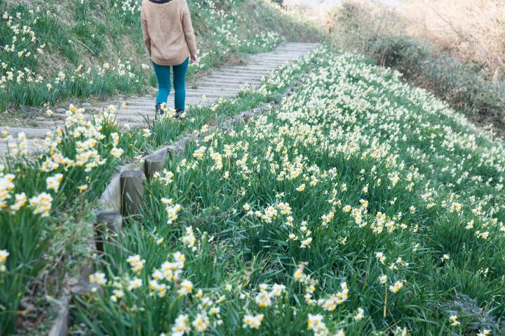 水仙の花畑をウォーキング。急な階段もあるので歩きやすい靴がおすすめです