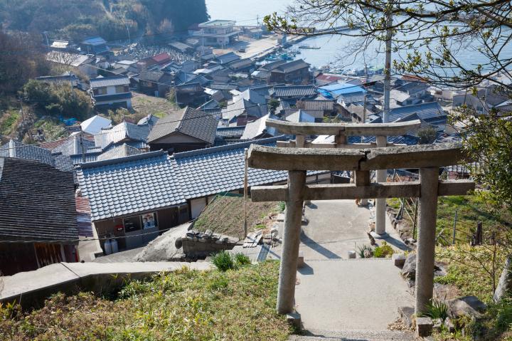 安産の神様を祀る神社から、集落と海を望む「豊玉姫神社」