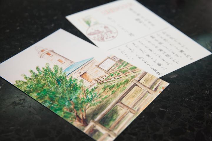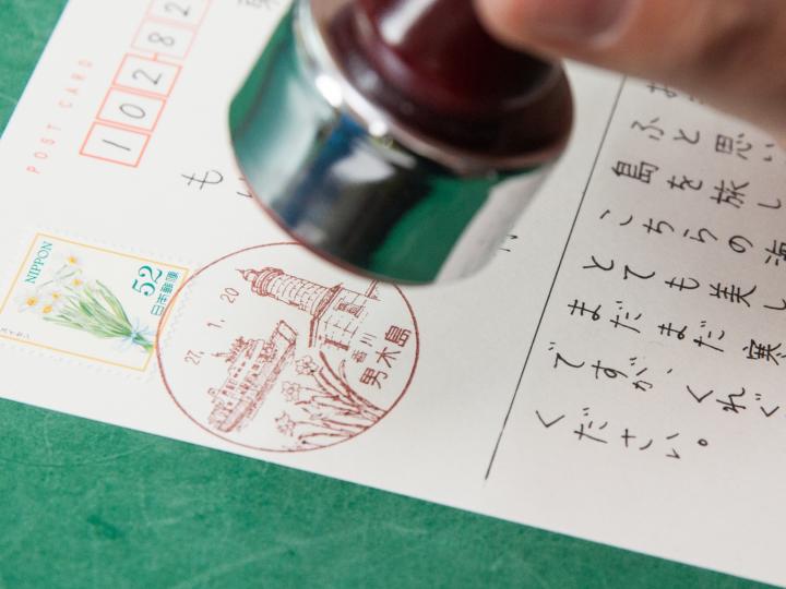 散策の途中に立ち寄った交流館で、素敵な手描きのポストカードを見つけました。灯台や港、集落など、島の風景がほのぼのとした優しいタッチで描かれています。すべて島の人による手書きなのだそう。男木島散歩の記念に、メッセージを添えて送ることにしました。 「男木島郵便局」では男木島灯台と水仙、フェリー「めおん号」をデザインした特別な消印(風景印(ふうけいいん))を押してくれます。素敵な風景印とともに、素朴で温かい島の雰囲気を伝えてくれそうです。 ○男木島郵便局(おぎじまゆうびんきょく) [所]高松市男木町143 [時間]郵便窓口9:00~17:00(平日のみ) [休]土、日曜