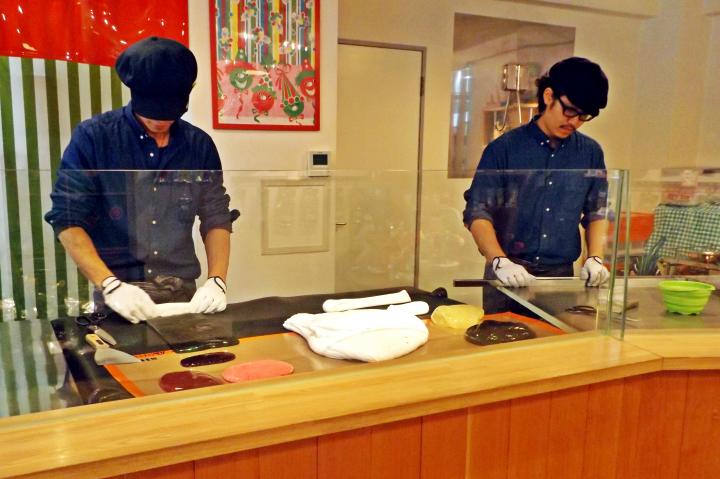 アメを煮詰めはじめると、店の中は甘い香りに包まれます。透明だったアメが次から次へと色付けされ、材料が手際よく組まれていく様子は、なんだか手品を見ているよう。とろんとしたアメが職人さんの手でどんどん変化していくのを見ていると「いったい、どんな模様が出てくるのだろう?」と、ワクワクしてしまいます。 仕込みから一粒のアメができあがるまでには、約2時間半もかかるそう。ていねいに作られたアメだからこそ、口に入れた時に優しい味わいを感じるのかもしれません。