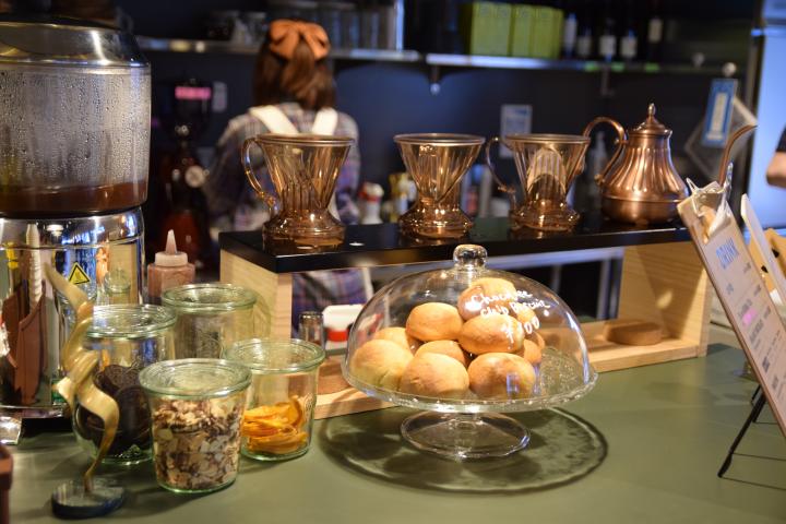 フードやドリンクは、ちょっとした遊び心のあるメニューが楽しめます。ソーセージの代わりに厚揚げを挟んだオープンドッグ「KITSUNE ツナドッグ」(600円)は、ヘルシーながらも食べ応えがあります。さっぱりと仕上げたテリヤキソースと厚揚げは相性ぴったりで、また食べたくなる味です。ほかに、アボカドやトマトが乗った「ガカモレ GUAC ドッグ」(600円)や「ビーフ CHEESE ドッグ」(800円)など全6種類。コーヒーか紅茶は+200円でセットにできます。 寒い時期にうれしい「オーガニックチョコレートドリンク」(600円)には、七味唐辛子とシナモンが入った「オーガニックチョコレートドリンク スパイス&チリ」(700円)というメニューも。カカオ72%ながらもしっかりと甘いチョコレートの味をスパイスが引き立て、すっきりとした後口に仕上がっています。