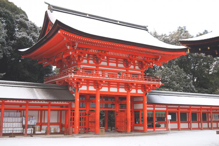 立春を過ぎて梅花がちらほらと咲きはじめ、少しずつ春の足音が聞こえてきた京都の街。とはいえ、まだまだ厳しい寒さから雪が舞い降る日もあり、今回は冬の京都ならではの、凛とした「京都の雪景色」をご紹介します。写真は下鴨神社・楼門。