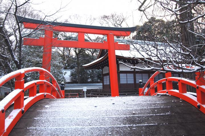 京都に雪が降り積もるのは、ひと冬にわずか数日だけ。それも、夜に降った雪が翌日の午前中には解けてしまうことが多く、京都の雪景色を見るのは一期一会の貴重な機会です。あらかじめ、天気予報で雪が降りそうな日をチェックして、当日の朝はできるだけ早く雪景色の社寺へ出かけてみましょう。 京阪電車・出町柳駅から北へ徒歩10分ほど、平安遷都以前に創建された歴史と由緒を伝える「下鴨神社」。雪が降ると、境内に広がる「糺(ただす)の森」が真っ白の幻想的な風景に変わり、朱の社殿がよく映えて色彩が際立ちます。降る雪がすべてを白く染めてゆく下鴨神社を、静かに参拝してみましょう。 ○下鴨神社(しもがもじんじゃ) [所]京都市左京区下鴨泉川町59 [TEL]075-781-0010 [時間]6:30~17:00 [拝観料]境内自由
