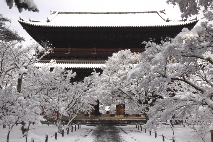 地下鉄・蹴上駅から北へ10分ほど歩くと、「南禅寺」が東山の麓に大きな境内を広げています。こちらは鎌倉時代、亀山天皇の離宮を禅寺に改めて創建された、由緒ある歴史と高い格式を伝える寺院です。 雪景色の南禅寺は、雪の「白」と建物や樹木などの「黒」からなる水墨画の世界。とくに三門楼上からの眺めは素晴らしく、床の間を飾る水墨画の掛け軸のような絶景が見事です。 ○南禅寺(なんぜんじ) [所]京都市左京区南禅寺福地町 [TEL]075-771-0365 [時間]三門拝観8:40~16:30(受付終了16:10) [拝観料]境内自由、三門500円