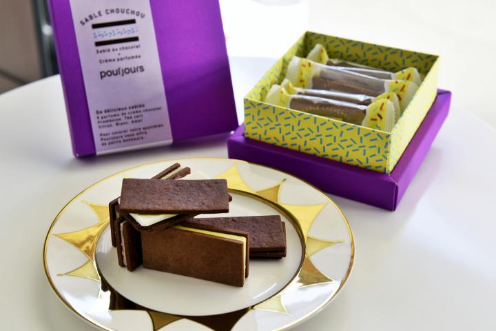 「サブレシュシュ」(5個入り1300円、10個入り2500円)は、香り豊かなカカオを練り込んだ生地にブラックペッパーを加えた、ちょっと珍しいサブレです。ホワイトチョコレートクリーム、ダークチョコレートクリーム、ホワイトチョコレートクリームにフランボワーズやレモン、抹茶を加えたクリームを挟んだ5種類があり、かすかに感じるペッパーの味と香りがチョコレートクリームの甘みをきりっと引き立てています。ボンボンショコラとともに、こちらのサブレを購入するお客さんが多いそうです。
