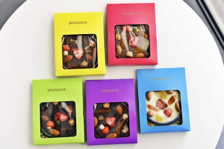 丸い板状のショコラにフルーツやナッツをふんだんに載せた「マンディアン・カラー」(600円)も人気商品です。カリッとした食感が魅力で、素材同士の繊細なマリアージュが楽しめます。種類によってカカオの含有量やトッピングが違うので、どれにするか迷ってしまいそう。 「日々の歓び」をテーマとしたプールジュールのショコラを、日々の暮らしの彩りに添えてみませんか?