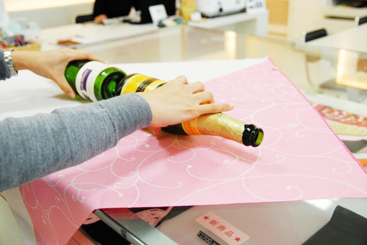 こちらのお店では風呂敷の販売だけではなく、包み方のレクチャーもしています。ディスプレイで気になる包み方があれば、その場で気軽に教えてもらえます。 早速、瓶2本を包んだ「合わせ包み」という包み方を教えてもらいました。瓶2本を左右に倒して風呂敷をくるくると巻きつけ、両端から瓶を起こして、結んだ端が縦にならないようしっかりま結びして完成です。使用した風呂敷は、包み方次第でいろんな表情を見せる「アラベスク(ローズ)」(2700円)。1本を包んでも色や柄が美しく映えます。