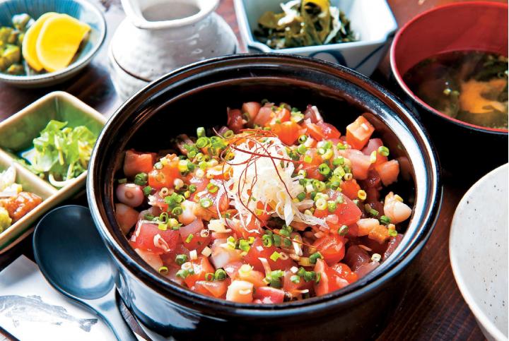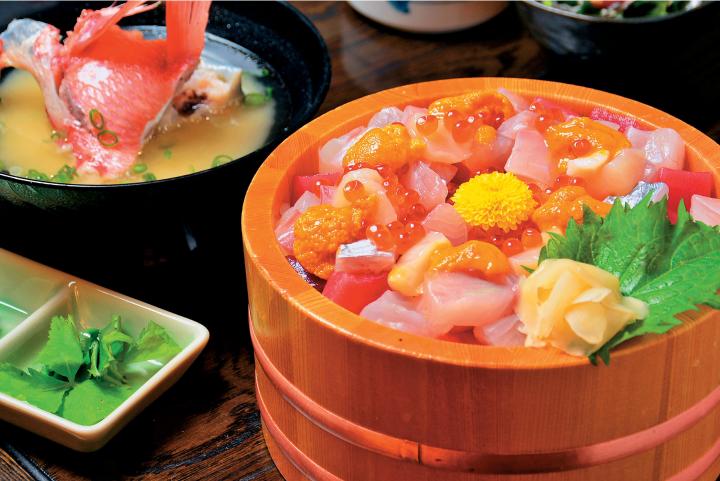 ワンランク上の海鮮丼を味わうなら、仲買直営の食事処「沼津かねはち」へ。朝、魚市場で競り落とされた鮮度抜群の海の幸がテーブルに並ぶ人気店です。 一番人気の「特選海鮮ひつまぶし」(2376円)は、旬の魚介が色鮮やかに器に敷き詰められ、まるで宝石箱のよう。そのまま食べてももちろんおいしいですが、薬味を載せてさっぱりと、温泉卵を落として濃厚に、そしてダシをかけてさらりといただくなど、素材の魅力をいろんな味わいで楽しめます。 その日に獲れた魚介によって変わる日替わりメニューも要チェック。底曳き網に掛かった深海魚が登場することもあるそうですよ。