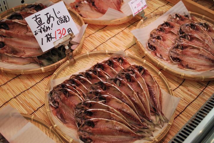 「真アジ干物定食」は、絶妙な焼き加減の肉厚なあじの干物と、おかわり自由のごはん、味噌汁が付いて、なんと540円! 創業100年を超える干物製造会社直営の店だけあり、味も折り紙つきです。カレイの煮付けやアジフライ、旬の刺身などをメインにした定食の種類も豊富なので、お腹を空かせて訪れたいですね。