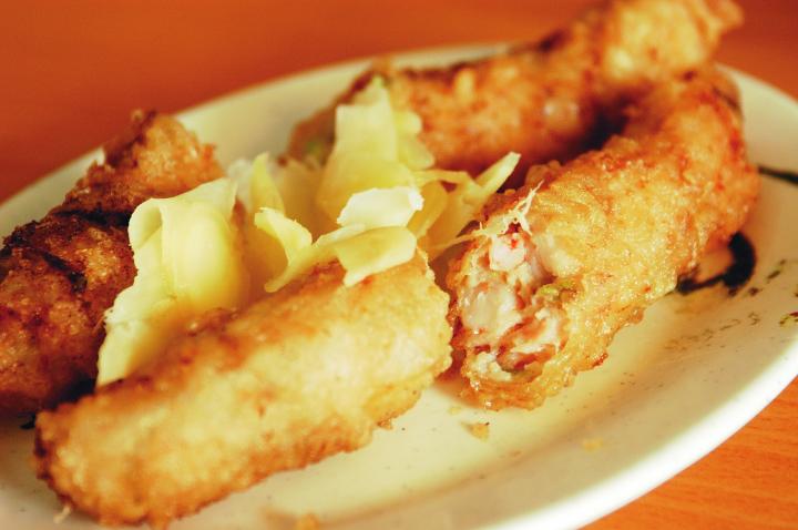 台湾版エビフライともいえる「蝦巻(シャージェン)」。 新鮮なアカエビ、上質な豚挽肉、魚のすり身、セロリ、ネギなどの材料を混ぜたあんを豚の網脂でくるみ、衣をつけて油で揚げたもの。どこから食べても新鮮な甘エビの味を楽しむことができます。夜まで行列が絶えない人気店「周氏蝦巻(ズォシーシャージェン)」では、世界一との呼び声も高い蝦巻を、気軽に楽しむことができます。