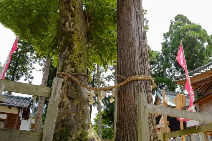 春日神社の境内にある「良縁の樹」は、大野に訪れたらぜひ立ち寄りたいスポット。 市内のパワースポットの中でも特にパワーが強いとされ、ここを目的として遠方からわざわざ訪れる人も多いそうです。樹齢100年以上のスギとケヤキが根っこで1つに結ばれており、この樹にふれると、恋愛や仕事、健康などさまざまな良縁に恵まれるといわれています。