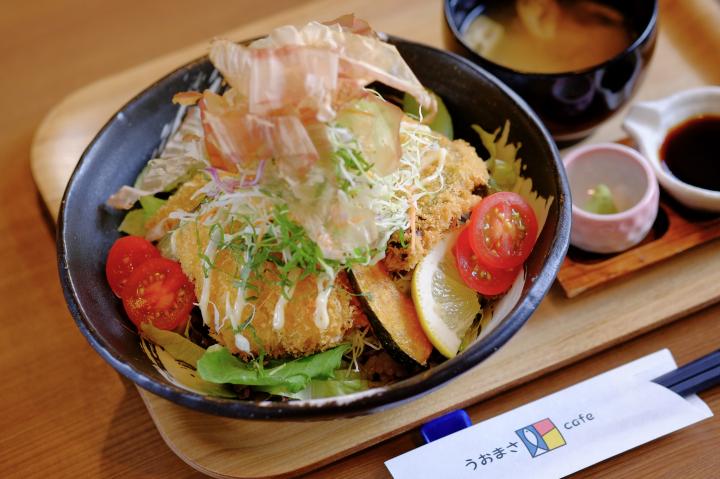 写真は「うおまさcafe」の「熟成鯖のSK(醤油カツ丼)」(1026円)。ハーフサイズ(単品)は600円