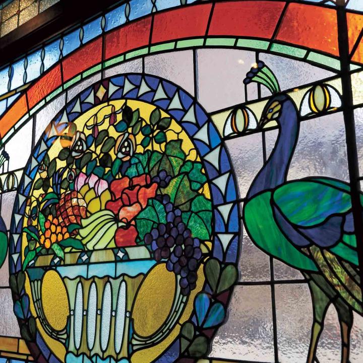 朱い壁にステンドグラスが映える、レトロモダンな意匠の町家