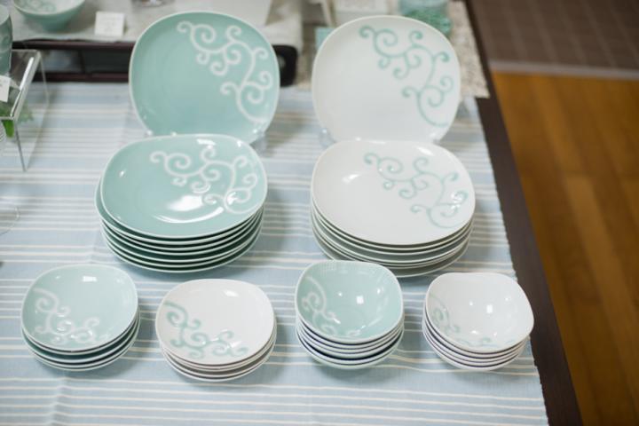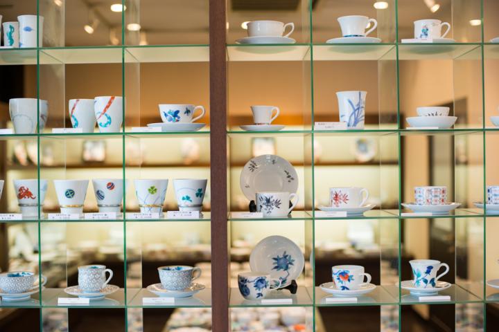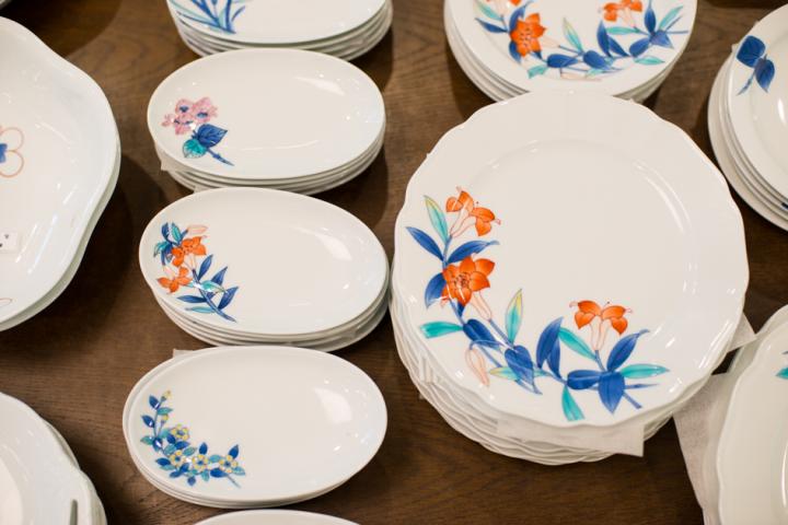 色鍋島のうつわ。現代の食文化に合わせた、機能的で美しいうつわが並ぶ