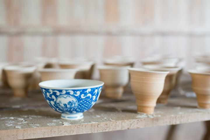 ギャラリーでとくに目を引いたのは、染付のめし碗。熟練の職人にしか描けない、という精緻な絵柄が白磁に映えます。