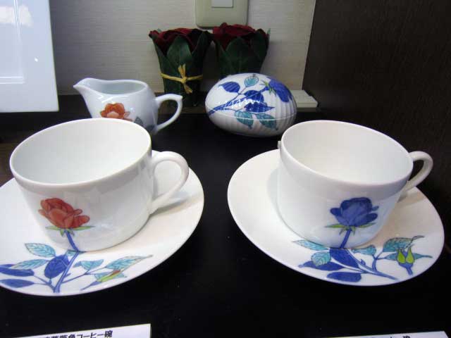すべて手描きで仕上げられた上品で華やかな絵柄のコーヒー碗が並ぶ