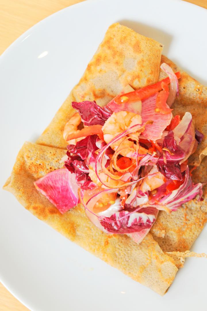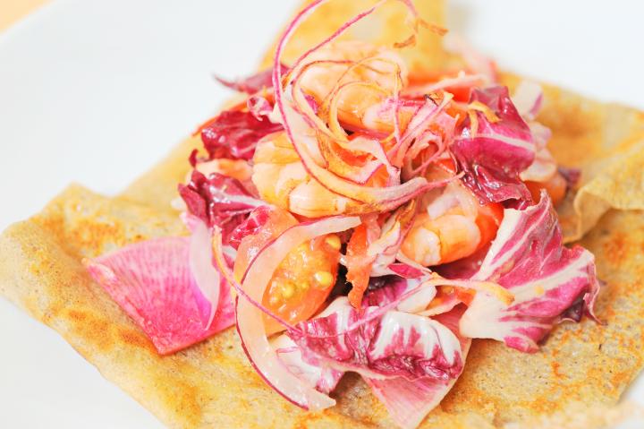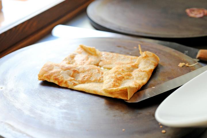 ガレットの生地には、そばの実を皮ごと粗挽きにした、香りの強い粉を使っています。さらにそばの香りを引き立てるため、シードルをプラス。厚さは、トッピングする食材の風味が消えないよう、ガレットの本場ブルゴーニュ地方と同じく、薄くしています。