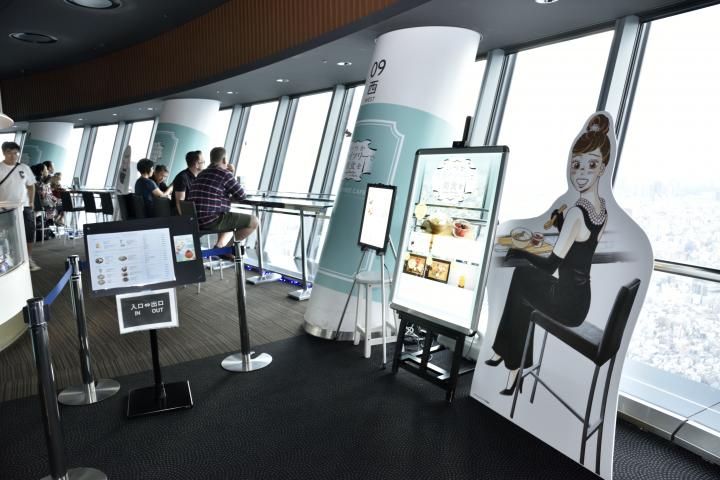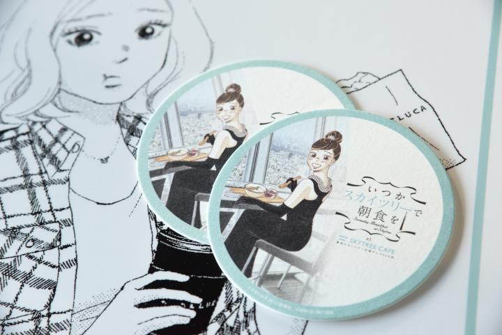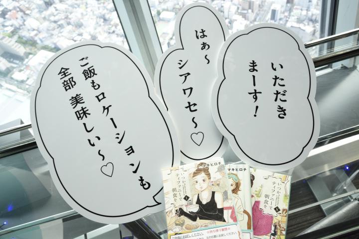 素敵なモーニングは、360度の大パノラマが広がる展望フロアからの眺めが人気の、各線押上駅直結「東京スカイツリー」でいただくことができます。地上340mの天望デッキ フロア340にある「SKYTREE CAFE」に、ヒロイン・麻里子のパネルや原画が飾られ、『いつかティファニーで朝食を』一色に染まっています。