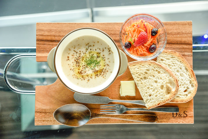 「ソラでほっこりクラムチャウダーのパンプレートセット」(1000円)。濃厚なスープにさっぱりとしたキャロットラペ付き