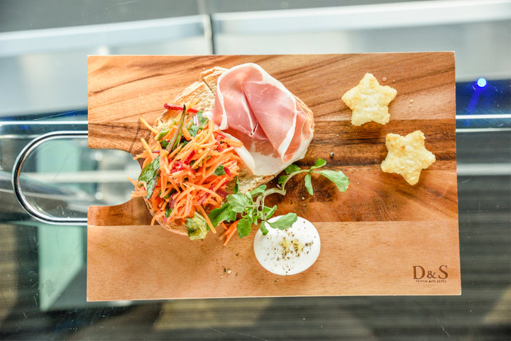 10時からはしっかり食べられるメニューが登場します。「ソラでほっこりクラムチャウダーのパンプレートセット」は、チーズのような香りがふわっと立ち上るやさしい味の温かいスープ。パンを浸していただけば、思わず”ほぅっ”と癒されてしまいます。しっかり元気になりたい時は「生ハムとキャロットラぺのオープンスカイサンド」を。生ハムやたっぷりの野菜に、トリュフオイルかかり、朝からリッチな気分になれます。半熟玉子がとろっしていてパンとの相性もベストマッチです。