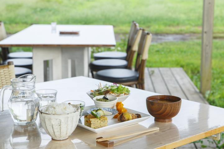 ランチでぜひ食べたいのは「かまどご飯セット」。 お米は県内の契約農家の田んぼでとれたミルキィクイーンとコシヒカリを甘みと旨みのバランスよくブレンドし、「秋葉の水」という近隣の湧水を使って炊きあげます。 かまどで炊いたごはんはもっちりした食感とコクのある味わいで、おこげの香ばしさが甘みを際立たせる逸品です。 セットのサラダやおかずの野菜も地のものにこだわり、朝市でその日仕入れたものと、敷地内に広がる畑で育てられた四季折々のものが使われます。