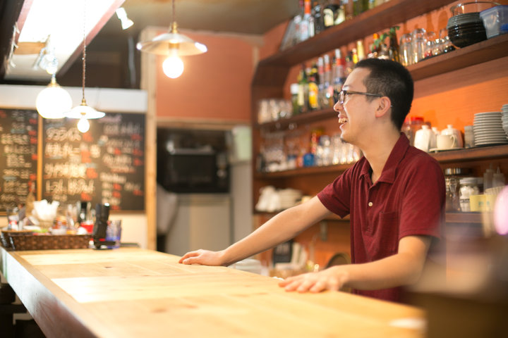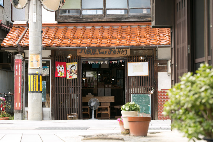 鳥取市街から南へ車で30分ほどの鹿野(しかの)は、400年前の水路がいまも流れる、情緒漂う城下町。 京格子の町屋が美しい街並みの一角に佇んでいるのが、「八百屋barものがたり」です。空家だった古民家を一からリノベーションしたというこのお店は、土壁や大きな木のテーブルが、どこか懐かしさを感じさせる雰囲気を持っています。