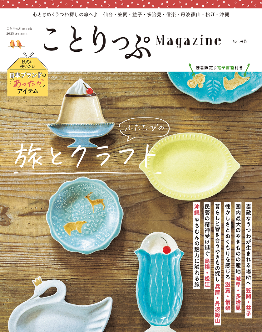 ふたたびの旅とクラフト その土地の土と風土から生まれ、暮らしに根差してきた‟焼きもの“。クラシカルな器はもちろん、洋食や洋菓子・スイーツを盛りつけたくなるような、新しい作家による洋風の焼きものもご紹介します。さらに、焼きものを生み出す窯元や、今話題の陶芸家へのインタビューも掲載。加えて、焼きものが購入できるセレクトショップや陶芸体験のほか、クラフトマンシップ...が光るパンや、秋ならではのスイーツもあわせて紹介します。