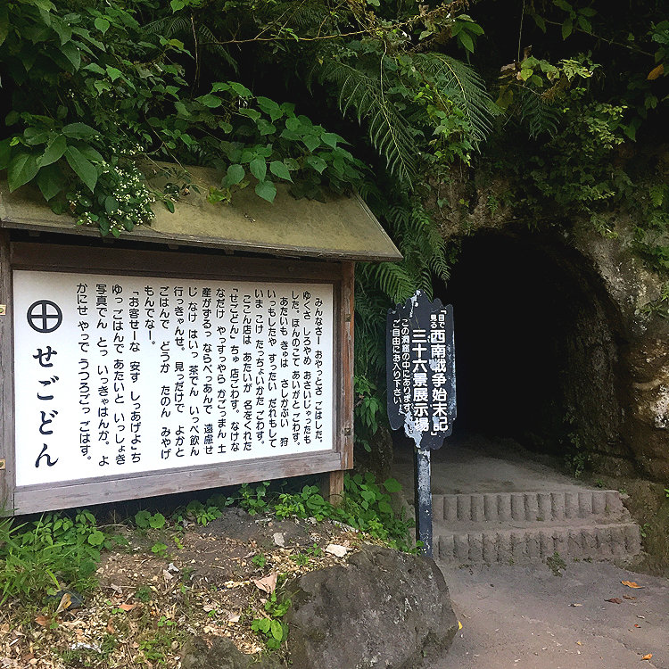 後方の洞窟内に絵画にて西南戦争の様子が分かる「目で見る西南戦争始末記 三十六景展示場」も。