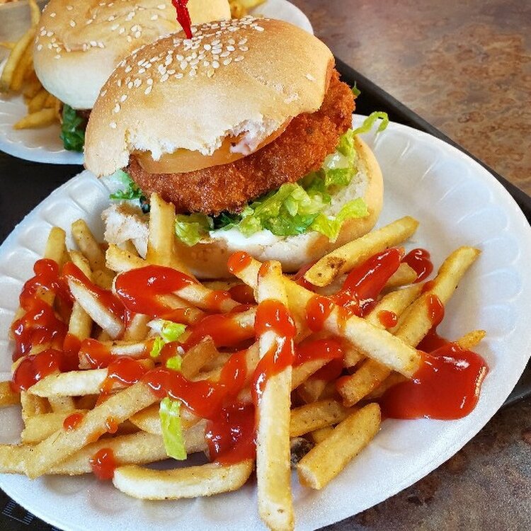 【メスクラドス】グアム・タムニン Kマートの近くにあるハンバーガー🍔 これはシュリンプバーガーです。 買い物の腹ごしらえにぴったりです