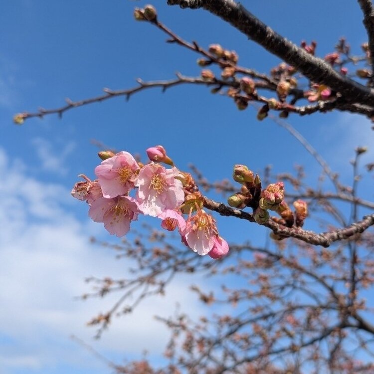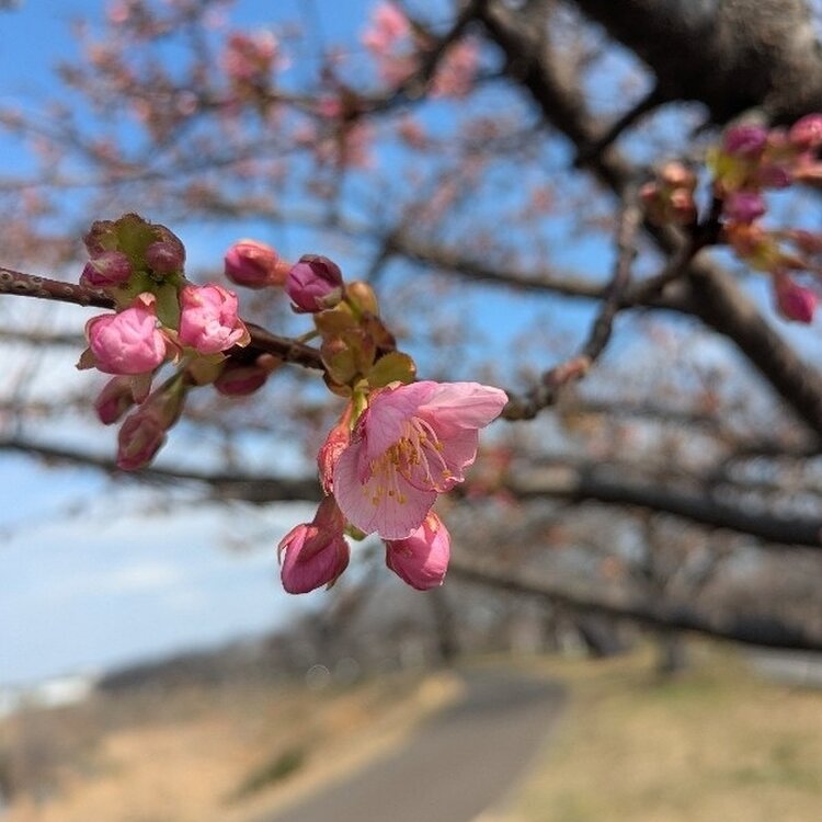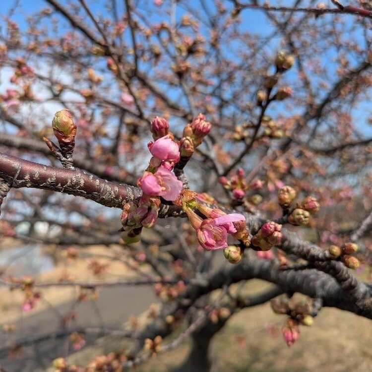 鶴見川土手 テクテク👣さんぽ 早咲きの幸福桜がほころび始めました