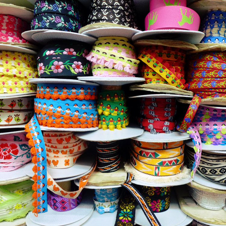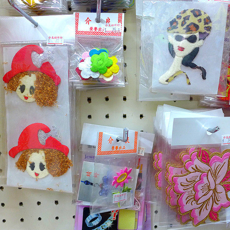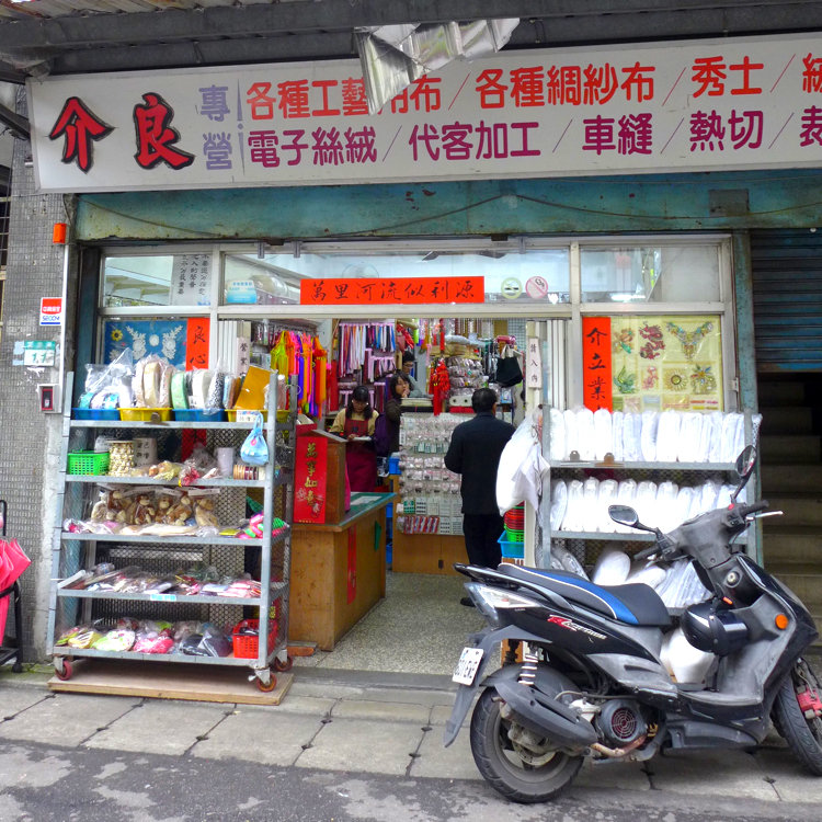 迪化街の永楽市場のまわりには、手芸小物屋さんが並んでいます。なかでも介良裡布行はカラフルなチロリアンテープやワッペンがたくさんあって、ながめているだけでも楽しいです。入口付近の特価品のハギレコーナーも見逃せません。