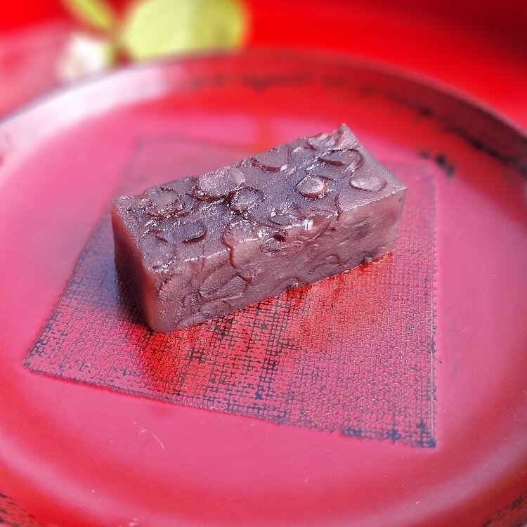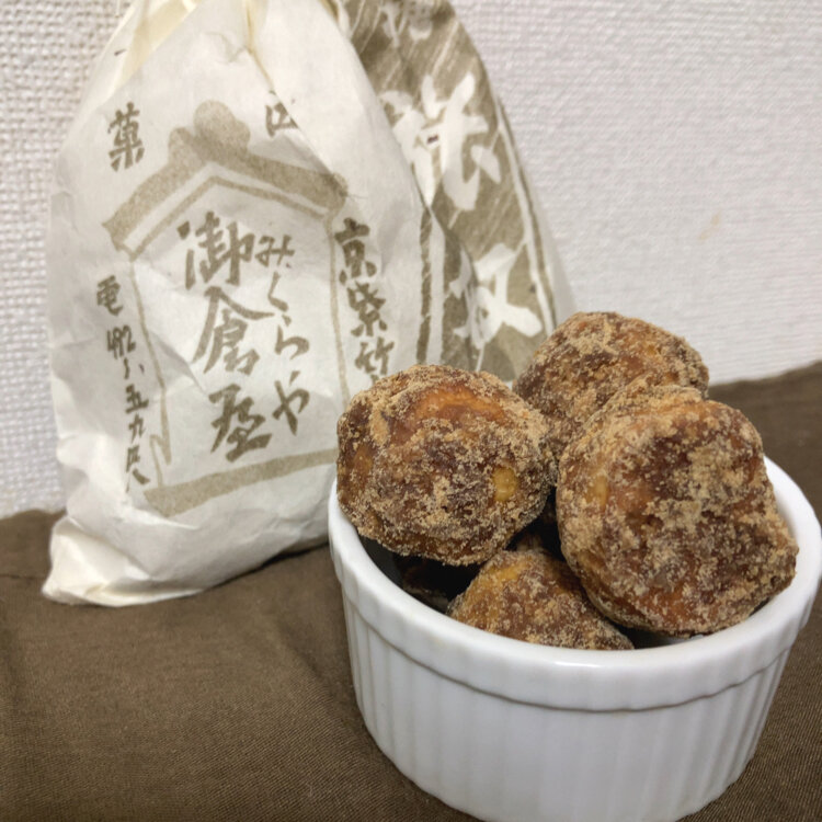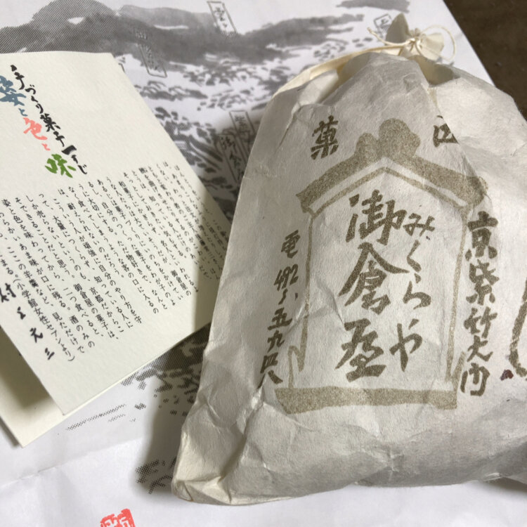 ぎゅっと詰まったカステラの様な生地を黒砂糖で固めて焼かれてます。素朴だけど上品な味わいの「旅奴」。お菓子の入った和紙の袋が又素敵です。お店の包装紙も京都の古地図を模してあって私の捨てられないシリーズです。