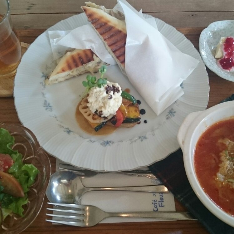 桑名にあるcafe fleur(フラワー)(*^^*) 植物性ランチのカフェです♪ 南仏をイメージして建てられたカフェのようで、とってもおしゃれな外観です♪ 店員さんもとても愛想がよく、ランチも全ておいしかったです(*´ー`*) 8日間で替わるランチが、一年周期くらいで回ってるみたいです(^^)何度来ても違うランチが楽しめますね♪