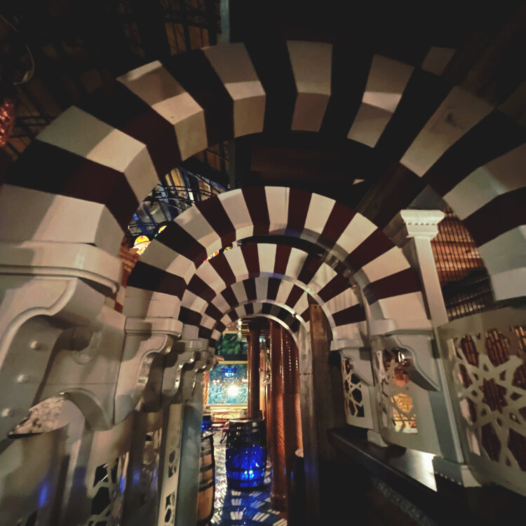 食後のカフェ・オ・レは2階席に移動して、店内装飾を見下ろしながら…
