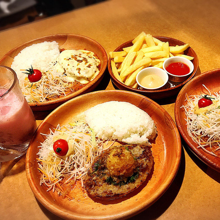 大好きなびくドン❣️ びくドンのバーグディッシュは、一皿の絶妙なバランスが素晴らしくて、もちろん美味しくて、大好き😍✨ お料理のネーミングもちょいちょい可愛い💕 飲み物がいちいち大きいのも好き✨ ディズニーみたいな外装も内装も楽しい♫ 4:00まで営業してるから、仕事終わりの真夜中の女子会にも🤣笑