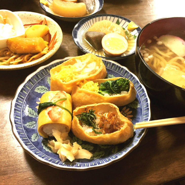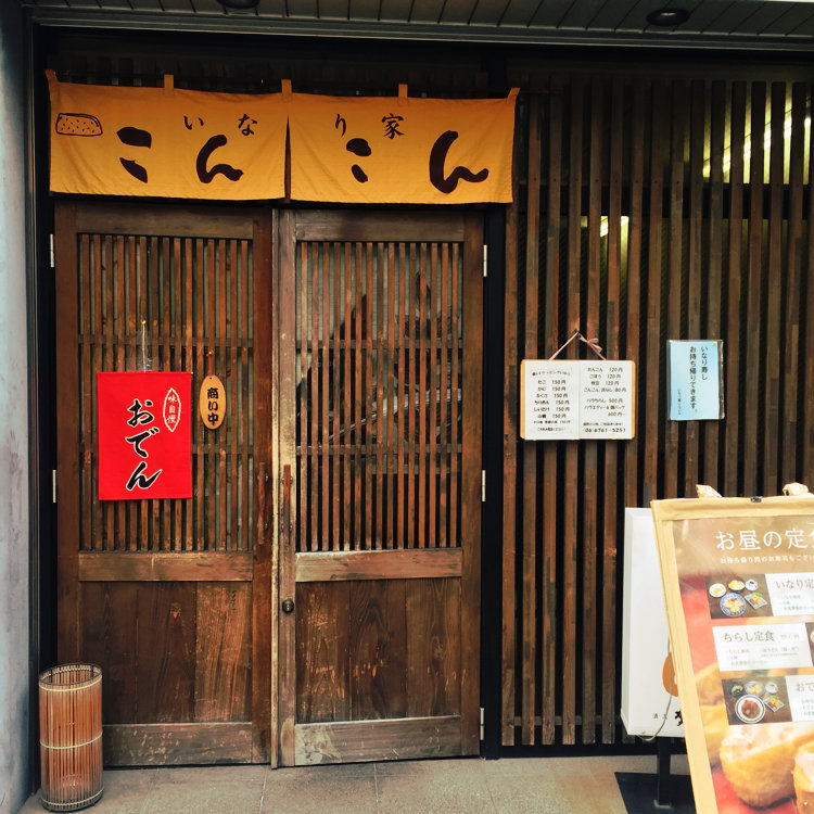 #いなり家こんこん #いなりセット #松屋町 #わたしの街 おいなり4種とおうどんにおでん、お惣菜、さらにコーヒー付きで700円。