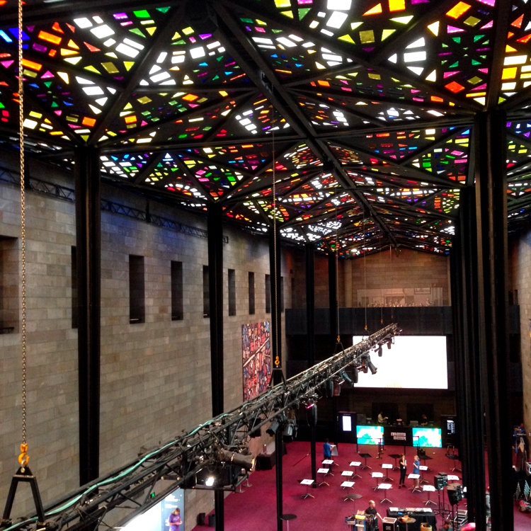 メルボルンにあるビクトリア国立美術館♪ 常設展は無料で、見ごたえたっぷりでした! こんなクールなステンドグラスの天井がある空間も。ここでライブの準備中でした。 メルボルンって身近にアートに触れられていい街!