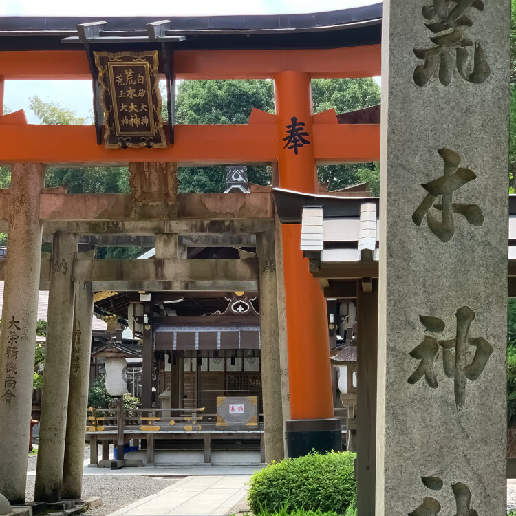 稲荷山登山道沿いの荒木神社は、縁結びの神様です。仲介のキツネの脇に夫婦を表すキツネ、合わせて三体を「口入人形」と呼び、授与された後、祈願成就の折に返納します。恋愛だけでなくあらゆるご縁を聞いてくださるそうです。