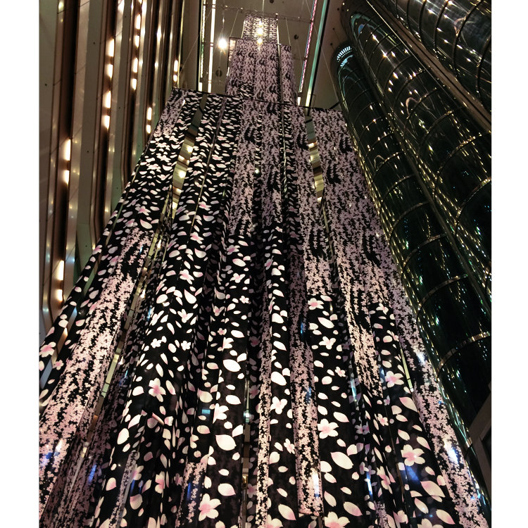 永楽屋14世細辻伊兵衛さんの企画です。花をテーマにイムズの吹き抜けに桜の花が舞い散るダイナミックなお花見空間は圧巻です❤️